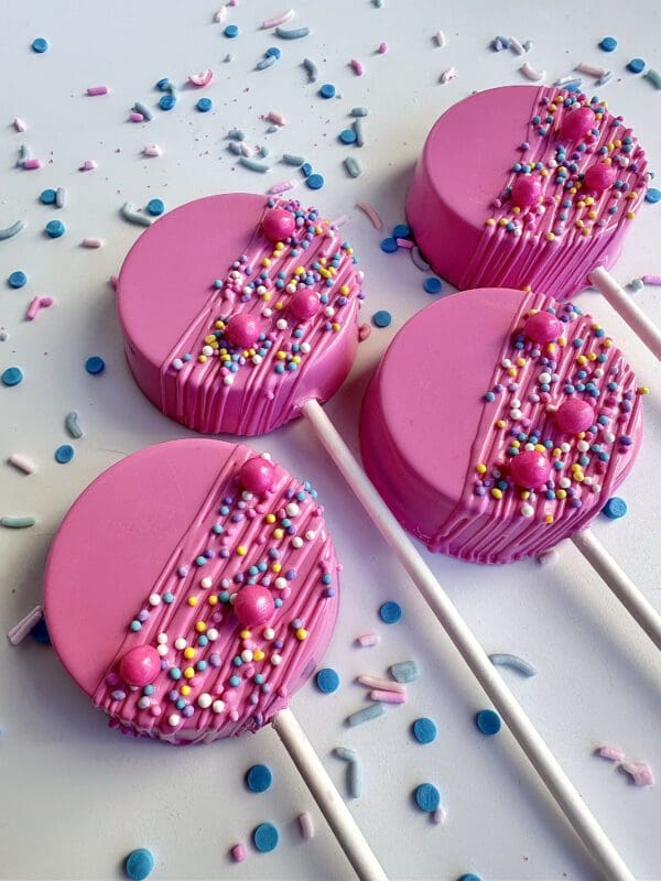 A fresh chocolate sandwich Oreo cookie is placed on a stick and sunk into a vibrant hot pink chocolate and then sprinkled with nonpareils on a bed of drizzle. They are so perfect for birthday gifts, get well, pick me ups, or just because. They also make great party favors for birthdays or any occassion for that matter.