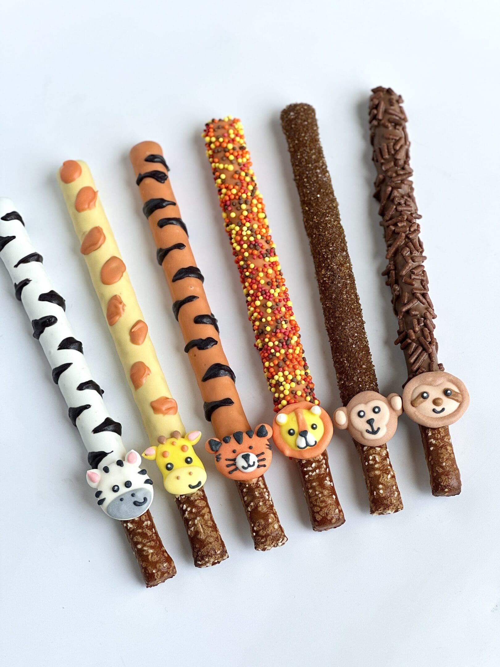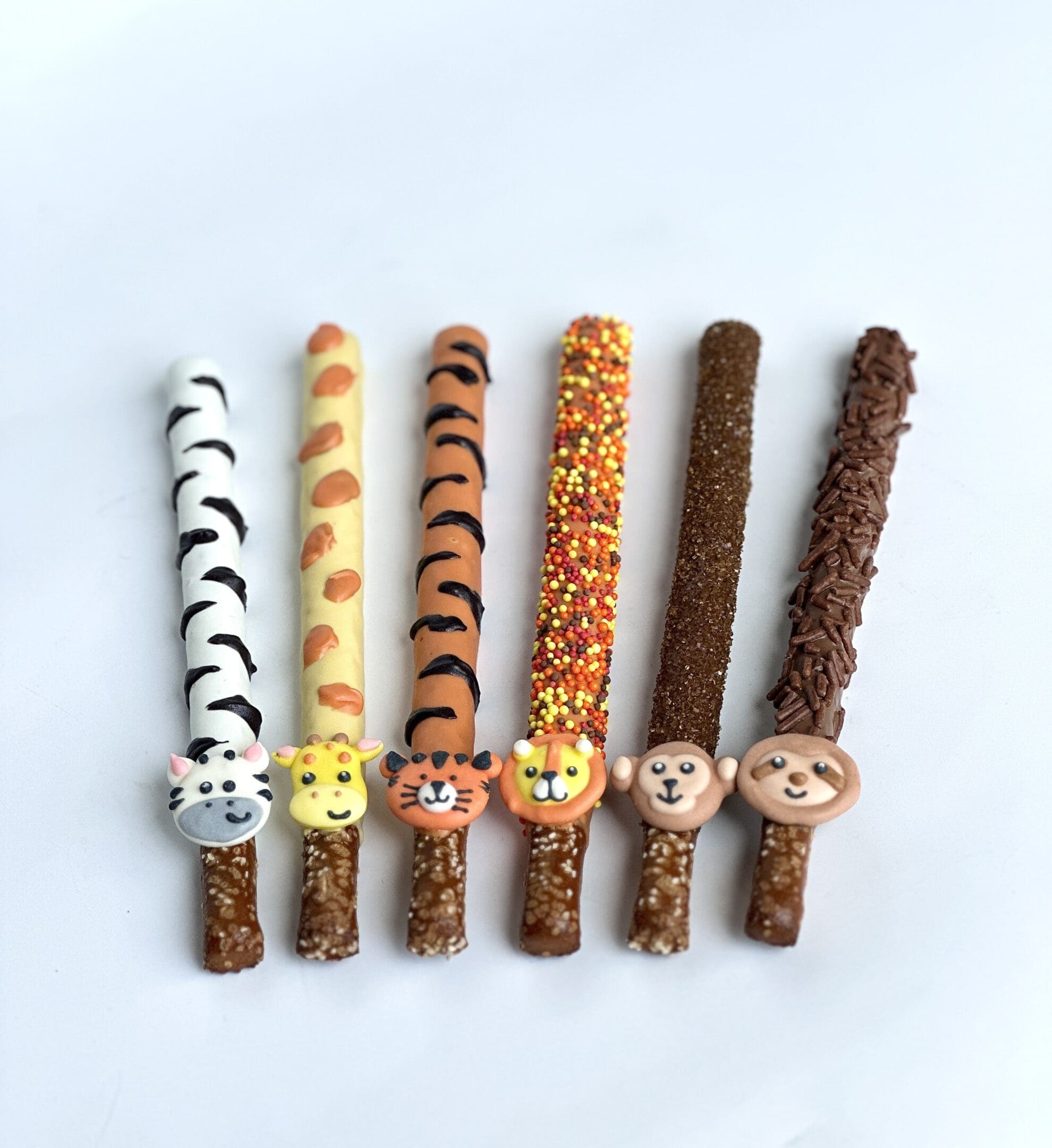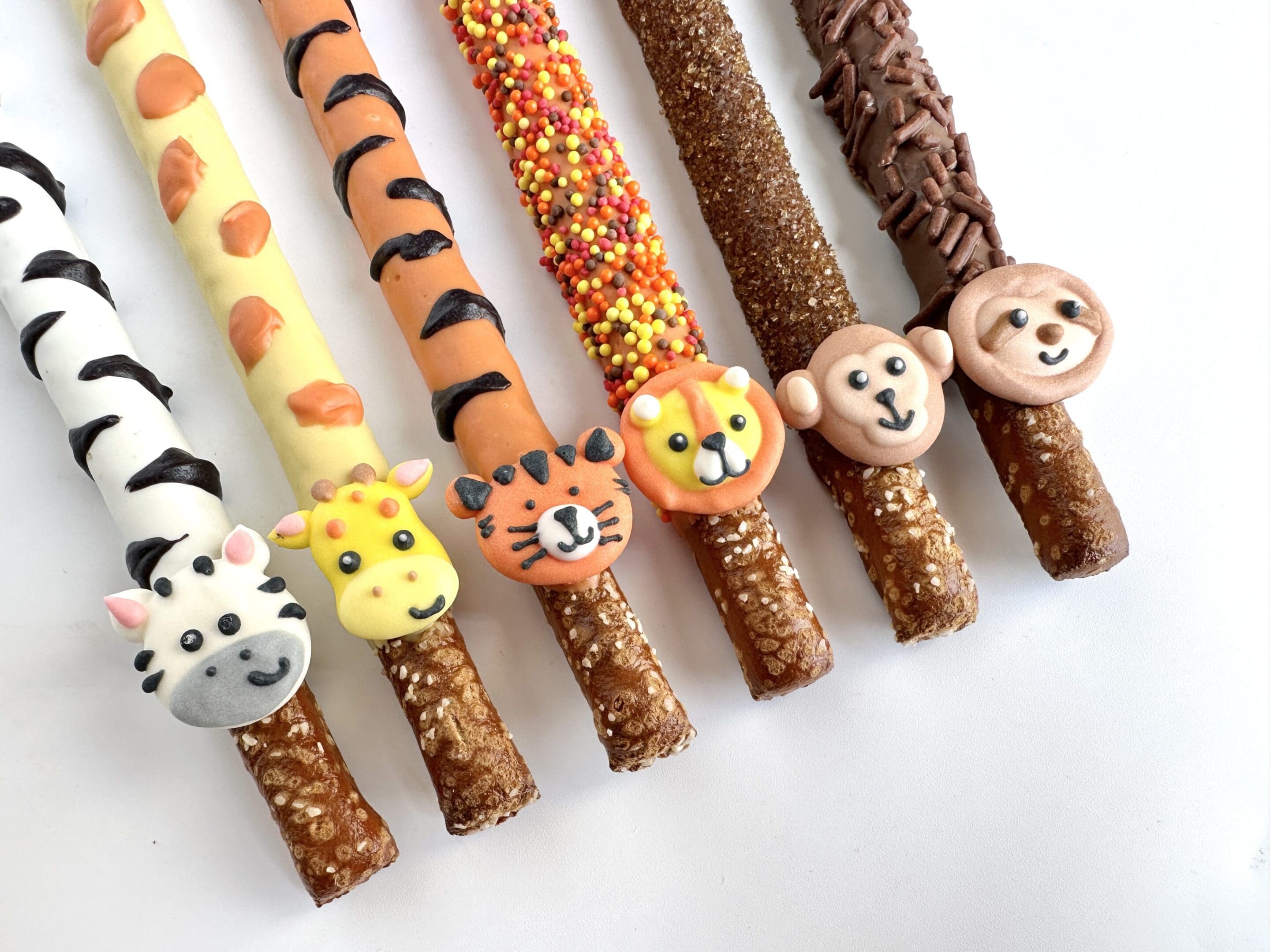 Bring the wild fun to your next celebration with this adorable set of 12 Jungle Critter Chocolate-Covered Pretzel Rods! Each salty-sweet treat is hand-dipped in rich chocolate and decorated to represent six beloved jungle animals: